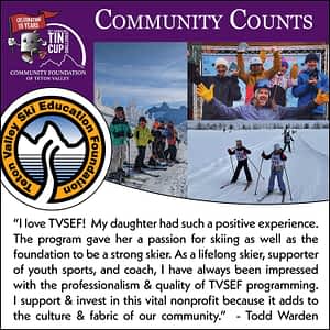 Please join me in sharing the joy of winter sports to all youth in Teton Valley when your gift has the biggest impact by making a donation to the Teton Valley Ski Education Foundation during the 15th Annual 2022 Tin Cup Challenge. Your donation ensures that all Teton Valley youth have the same access to quality programs and activities that can last a lifetime!