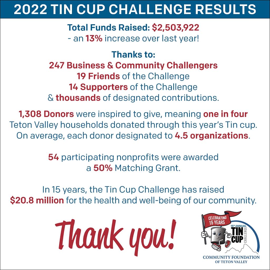 One thousand, three hundred eight donors were inspired to give during this year’s Tin Cup Challenge – meaning that one in four Teton Valley households participated in charitable giving through the 2022 Tin Cup Challenge. In fifteen years, the Tin Cup Challenge has raised $20.8 million for the health and well-being of Teton Valley, a community of 11,000+ residents.