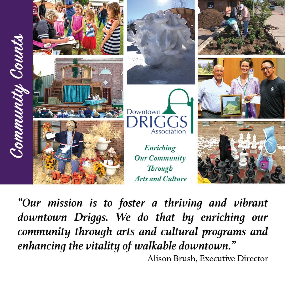 Beautiful, creative, lively downtown Driggs! In these challenging times, it is our community togetherness, even apart, that creates a sense of knowing that this truly is OUR ‘place’. The Downtown Driggs Association’s mission, to foster a vibrant and thriving downtown Driggs, drives our programming to strengthen and revive our downtown and remind us why we love this community. Since our start in 2003, our programming has provided free art, music, theater programs, and main street activities for all to enjoy. In 2019 we hosted 185…
