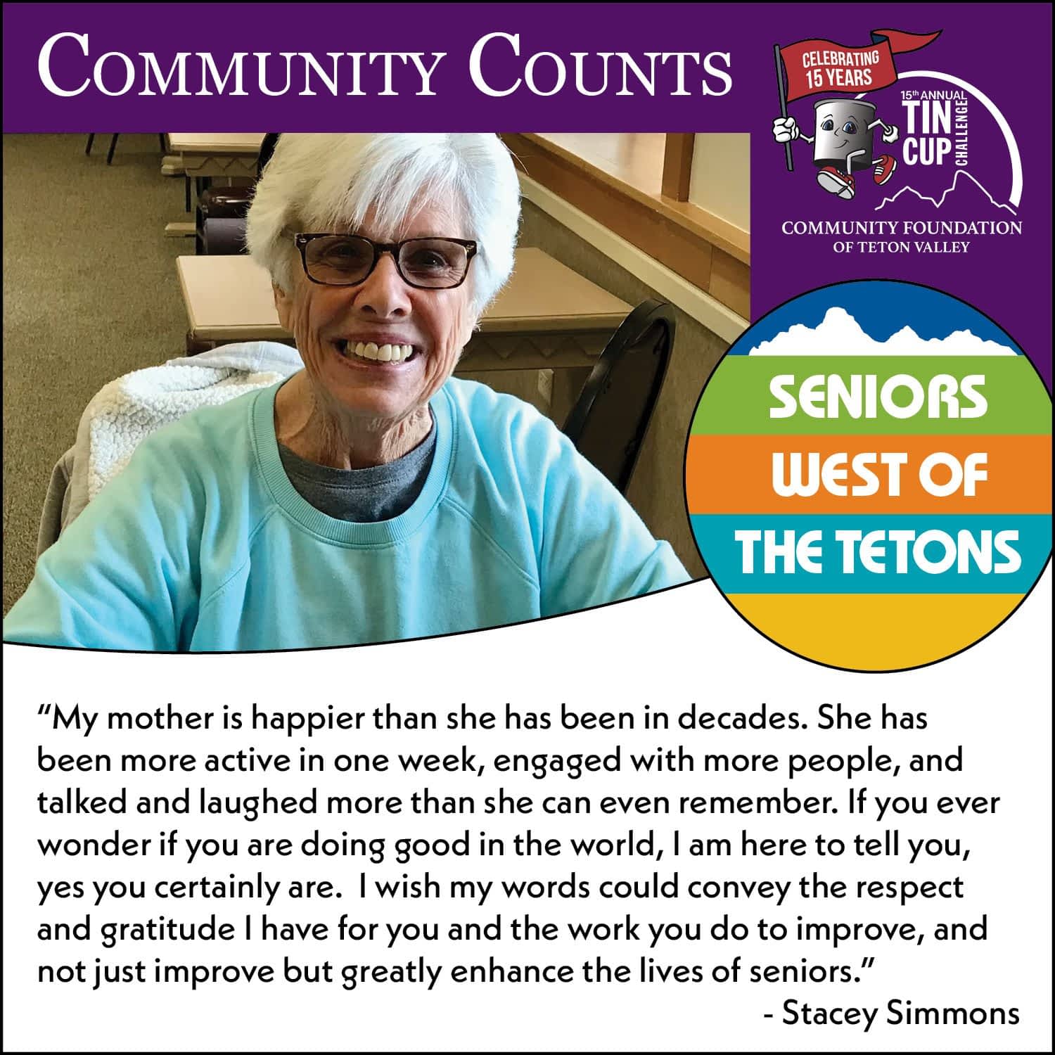 Let’s count the ways your support of Seniors West of the Tetons during the Tin Cup Challenge makes Teton Valley great! Your contributions enable SWOT to assist seniors by: Filling tummies. Prompting movement. Focusing minds. Advice for smartphones and computers. Exploring nature. Screening for health issues. Support in their homes. Combating loneliness. Tapping their creativity. Getting outside. Exposure to live entertainment. Touring local businesses. Trying new activities. Holding movie and pizza nights. Tuning bicycles. Visiting local attractions. Supplying medical equipment. …