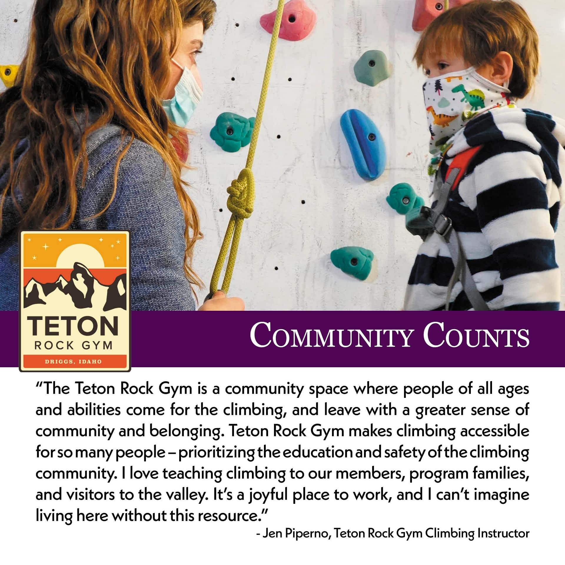 Teton Rock Gym is more than just a climbing gym. It’s a special place where community members and newcomers can have a home base, a place to meet up, rain or shine, to make new friends, and spend time with family. Teton Rock Gym is a place where people build the kinds of relationships that make a place a home. For the children that come here, it’s a place where they are comfortable being themselves and feel safe to try…