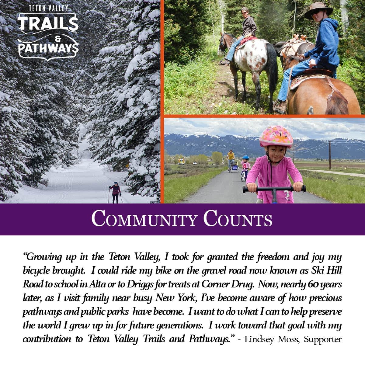 Teton Valley Trails and Pathways works to improve your self-powered pursuits. Your contribution is used secure grants, build/maintain year-round trails, purchase vital equipment, and advocate for a better quality of life in Teton Valley. How We Make a Difference — To Communities: Trails and Pathways is a reliable partner, bringing in expertise and funding to help local government and non-profits integrate pathways into their planning and infrastructure. Your support allows us to maintain and expand these relationships on your behalf. …