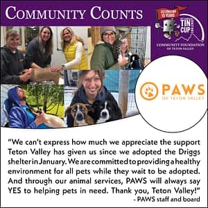 Our commitment in 2022 and beyond is to the animals – ensuring every local pet receives vital care and is provided a safe and healthy environment while waiting to be adopted. With your help, PAWS will also continue to provide social services (spay/neuter, help with vet bills) to Teton Valley pet owners and pets in need. We are a nonprofit funded by private donations and grants. Your support is a crucial part of our success.