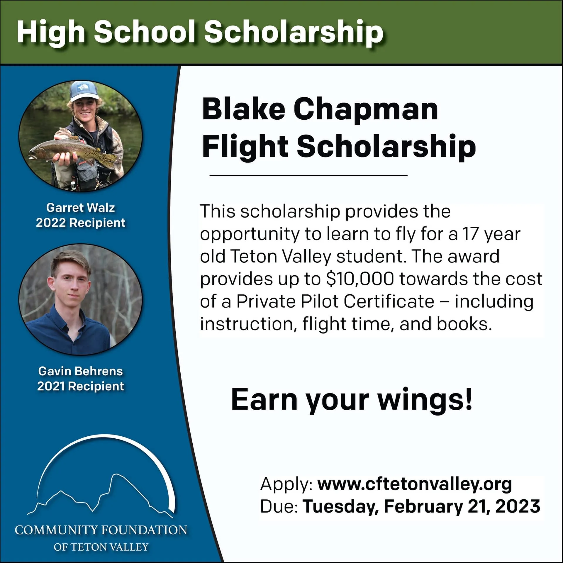 The Community Foundation of Teton Valley announces that applications are now being accepted online for the Blake Chapman Young Eagles Flight Scholarship. This scholarship opportunity was created by a