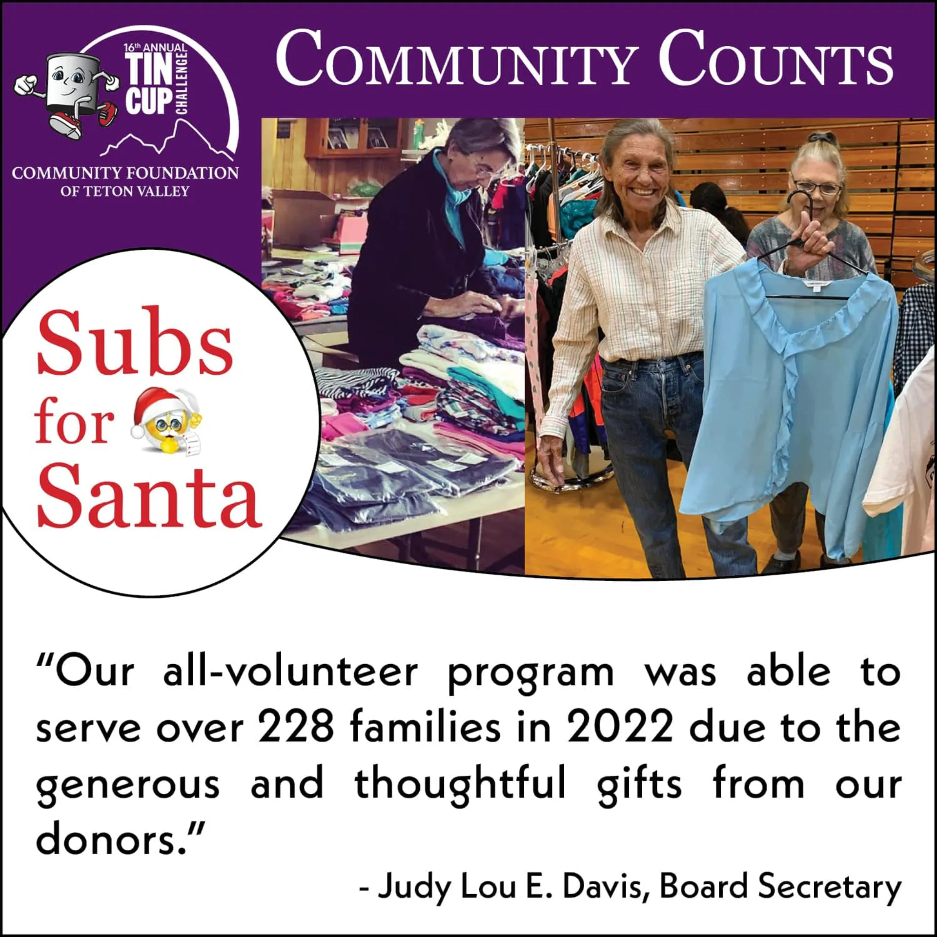 Total Funds Raised During Teton Valley’s Premier Giving Event Surpass $1 Million Thanks to the incredible generosity of the Tin Cup Community Challengers and individual donors, the Community Foundatio